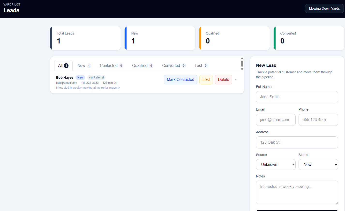 YardPilot helps lawn care businesses manage leads, customers, scheduling, invoices, and payments in one clean system.